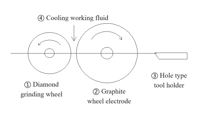 ② Grafithjulelektrod: Använd ett grafithjul som är lätt att bearbeta som en elektrod, applicera principen för utloppsbearbetning och använd en elektrisk gnista för att ta bort den del av diamantsliphjulet för att bearbetas. Det yttre hålet på grafithjulet vrids och bildas av en hålskärare klämt på verktygshållaren.